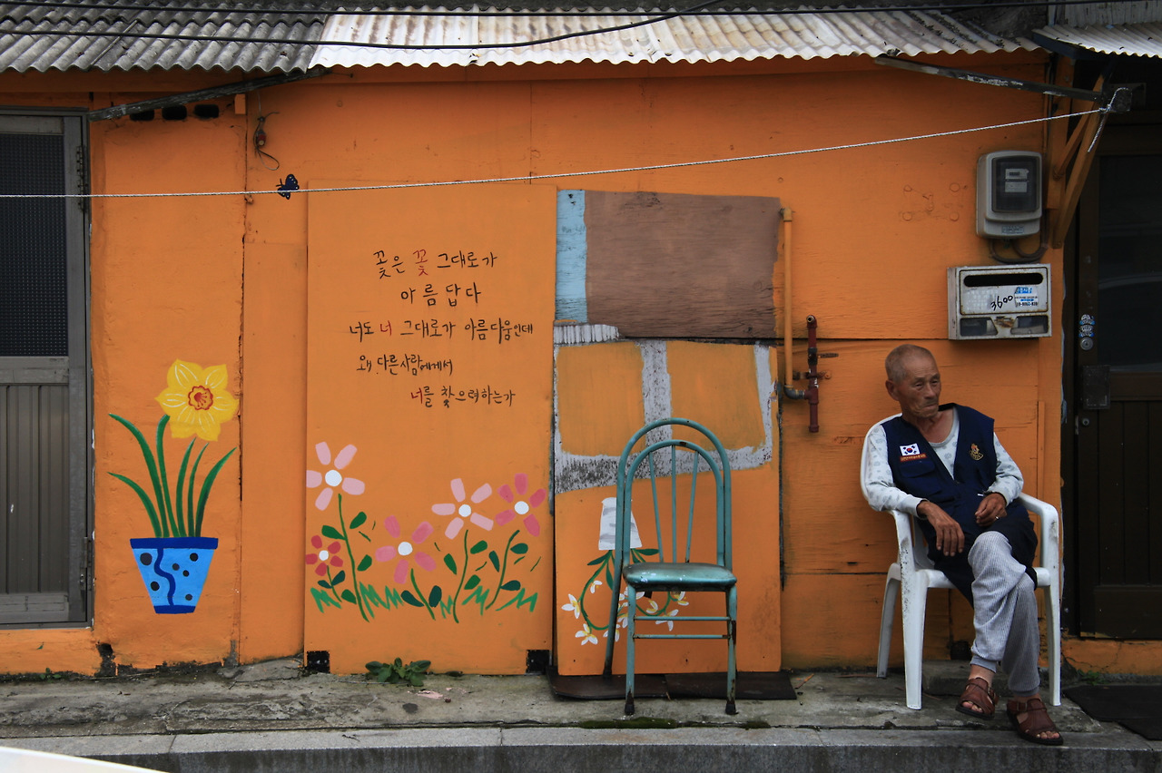 노인의 뒷 벽에는 벽화가 그려져 있었다. 밝고 따뜻한 색감으로 덧입혀진 벽에는 희망과 자존심을 찾으라는 메시지를 담은 틱낫한의 글귀도 함께 적혀 있었다. 한때 낡고 퇴색했던 골목이 새롭게 단장된 모습은 마치 과거의 흔적 위에 미래를 덧그리는 듯했다.